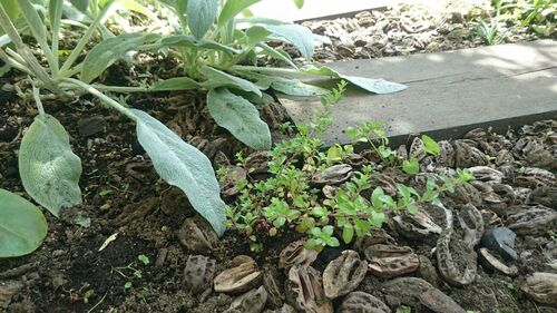 種から育てたクリーピングタイムを植え付けました。アブラハムダービーの蕾もきれいに開きました。いい天気だった昨日の朝のことです。花弁の中に潜り込んで、花粉を集めている蜂さん。よく見ると足に花粉団子を付けています。自然の生き物が活動場所に我が…