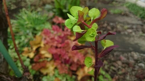 英名 : Euphorbia amygdaloides "purpurea" : ユーフォルビア アミグダロイデス "プルプレア" 花が咲いています。 冬の寒さで葉が赤くなり、さらには葉が落ちたヒョロヒョロ姿で、まるで先日テレビで観た"チンアナゴ"のようです。 ゆらゆら~ 今朝はちょっと…