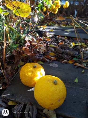 朝8時。ガーデンリフォーム会社の敷地内をぐるぐる歩いてカギを開けます。少し前の急な冷え込みに、植物たちも霜をまとって。またひとつ、季節が進んでゆきます。 11月19日の穏やかに晴れた庭を道路から眺めると、色付いた柚の実を見つけました。今年は裏年…