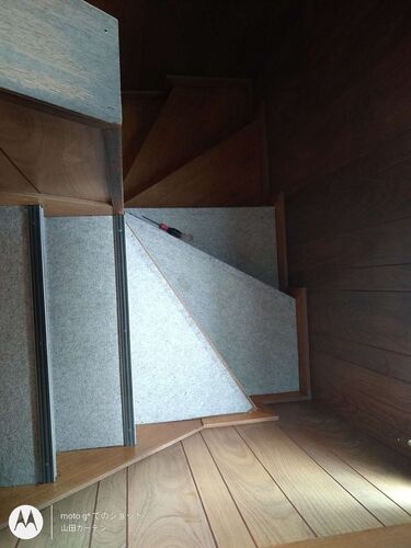 階段に貼ってあるグレーのパンチカーペットは、内覧した時から、私なら剥がす!と思っていました。 せっかくの木材を、パンチカーペットで隠してしまうのはもったいないよね、と珍しく主人と意見が合ったことのひとつです。