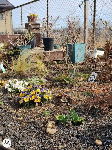 高台の家の庭にも春の気配。チューリップが顔を出し、バラの芽も伸びてきました。