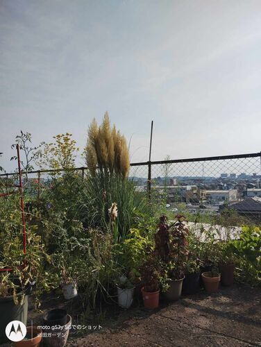 株分けして移植したパンパスグラスに、立派な穂が上がりました。想像どおりの景色ができ上がりました。 日中は猛暑だけれど、空はもう夏ではない。入道雲が浮かぶこともなくなってきました。
